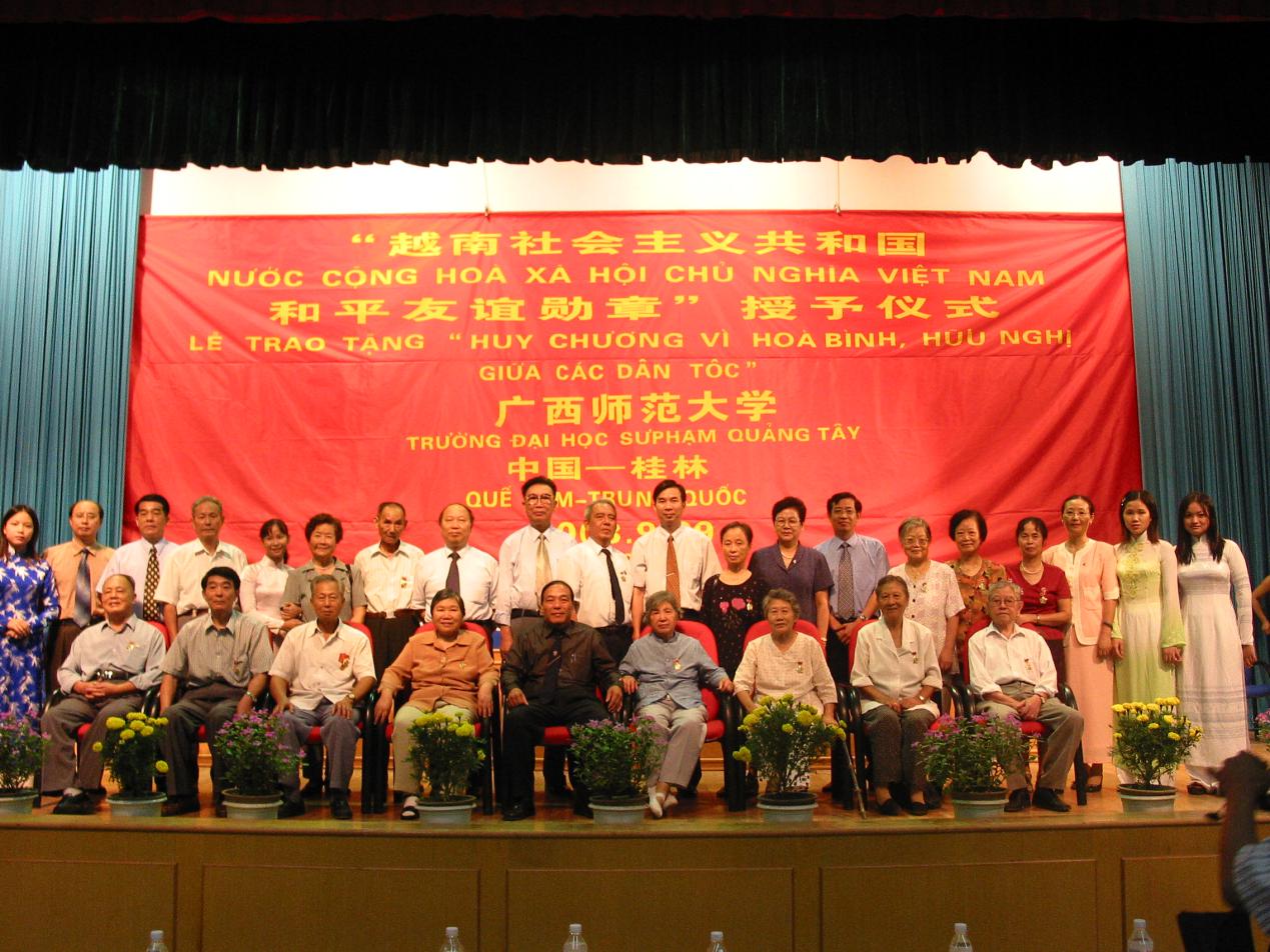 2003年9月29日,为表彰在上世纪越南学校教育工作中做出贡献的中方人员,越南社会主义共和国“和平友谊勋章”授予仪式在广西师范大学隆重举行。我校部分领导、教师应邀参加。