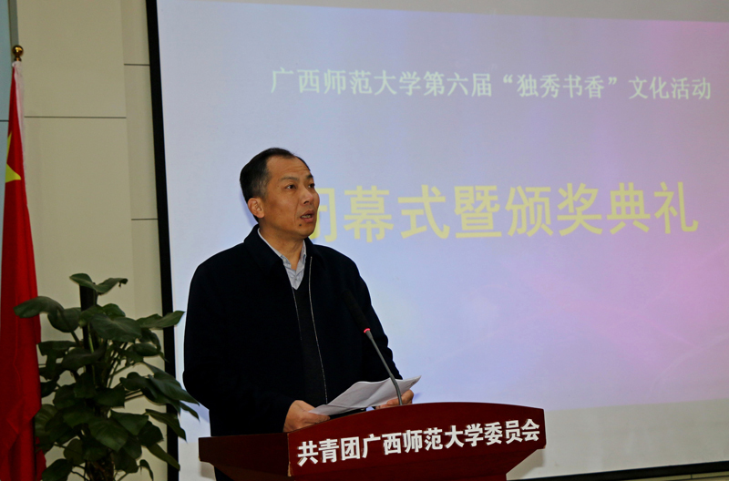 校党委副书记旷永青在闭幕式致辞中表示:作为一个历史底蕴丰厚的综合性大学,我校具有良好的阅读风尚和传统,“独秀书香”文化品牌活动的开展,便是这一风尚的延续。我校图书馆在文化育人和服务育人方面为学校做出了积极的贡献,希望图书馆乘势而上,在认真总结2019年工作的基础上,充分发挥图书馆文献资源中心、文化中心和阅读中心的功能,积极谋划,切实在阅读推广、文化服务、科研服务等方面发挥更大的作用;要充分运用好雁山新馆的硬件环境,进一步营造浓厚的书香氛围,让学生愿意来,坐得下,学得进,为营造良好学风作出更大贡献;要坚持改革创新,进一步打造好“独秀书香”品牌,加强宣传,扩大影响,提升品牌美誉度,让更多同学了解“独秀书香”,喜欢“独秀书香”;要积极开拓创新,进一步丰富各种文化活动的内涵,吸引更多学生的参与,推动阅读服务向学习研究各环节延伸,向学生社区各区域延伸,向文化建设各领域延伸,将独秀精神传承和发展下去,为学校深化综合改革和“双一流建设”发挥更大作用。