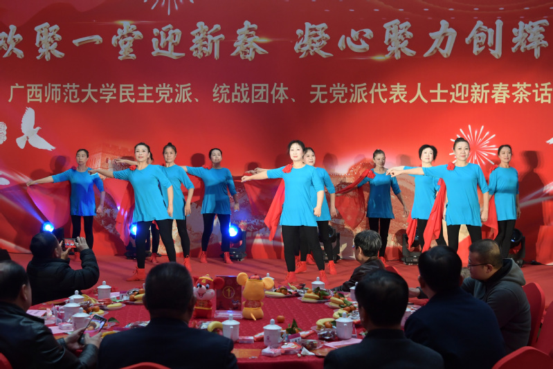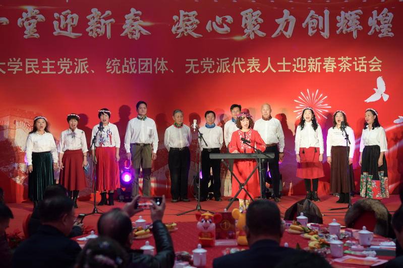 民主党派、统战团体代表在茶话会上进行了精彩的文艺演出。茶话会在优美动听的《我和我的祖国》歌声中结束。