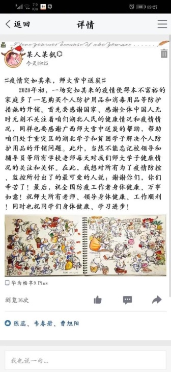 部分获补助学生在社交媒体平台表达对学校的感谢