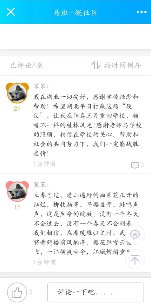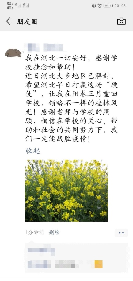 我在湖北一切安好,感谢学校挂念和帮助。近日湖北大多地区已解封,希望湖北早日打赢这场“硬仗”,让我在阳春三月重回学校,领略不一样的桂林风光!感谢老师与学校的照顾,相信在学校的关心、帮助和社会的共同努力下,我们一定能战胜疫情!