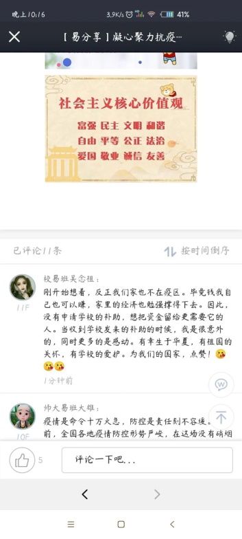 “当我们面临困难、需要帮助时,学校总是为我们着想,时刻关心着我们的安危和成长。学校不仅为我们湖北籍家庭困难的同学提供了资金上的帮助,而且每天都关注我们的身体健康。”这是化学与药学学院的王硕秋同学在收到“新冠肺炎防控专项特殊困难补助”后留下的真挚感言。而作为收到疫情防控网络学习补助的同学中的一员,来自体育学院的叶超雄也觉得心里特别温暖,这不仅是一份物质上的帮助,更是国家和学校在最关键的时刻给予的度过疫情难关的力量。他坚信只要我们初心不改、矢志不渝,定能用双手托举起希望和美好!
