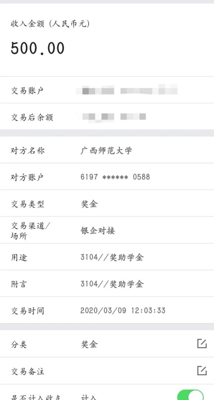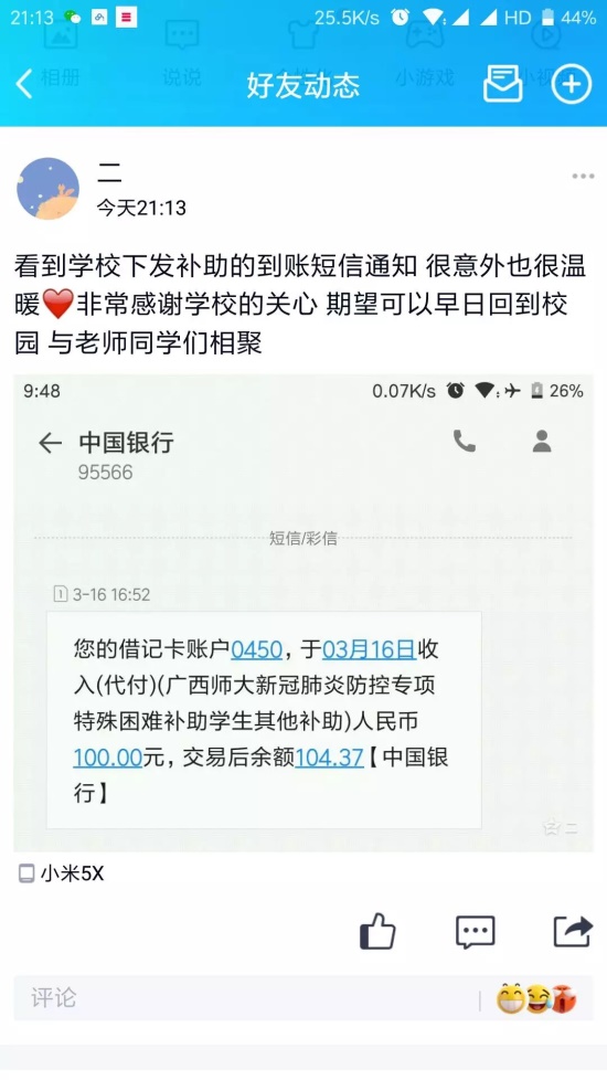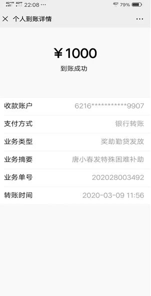 看到学校下发补助的到账短信通知很意外也很温暖,非常感谢学校的关心期望可以早日回到校园与老师同学们相聚。