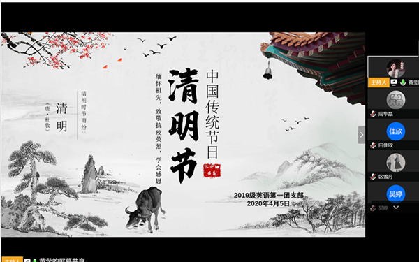在疫情防控的关键时期,外国语学院坚持以“云端”第二课堂活动为平台,严抓学生思想政治教育,将线上班会和党团日活动打造成特殊时期学生德育的新阵地,努力营造良好的育人氛围。