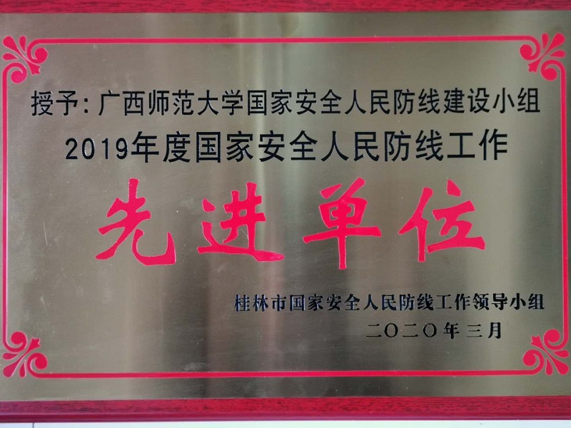 近日,桂林市召开会议,对2019年度国家安全人民防线工作的先进单位和优秀个人进行了表彰,我校荣获“2019年度国家安全人民防线工作先进单位”,罗蕾同志荣获“2019年度国家安全人民防线工作优秀个人”。