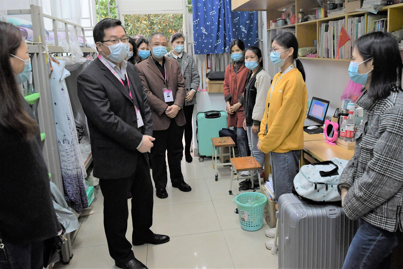 随后,邓军来到第一期学生宿舍,实地察看了学生返校住宿场景,了解学生返校住宿防控与公寓环境情况。邓军亲切询问学生的防控准备与就业情况,他还告诉同学们要做好近期在校规划和毕业规划,以积极的心态面对近段时间的学习生活。