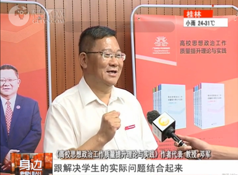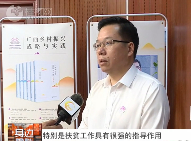 发布会上,邓军书记、贺祖斌校长分别就《高校思想政治工作质量提升理论与实践》与《广西乡村振兴战略与实践》这两套书的编写工作进行了交流分享。同时,桂林电视台对我校党委书记邓军和校长贺祖斌进行了采访。邓军表示,在思政工作中,需要把解决这个思想问题跟解决学生的实际问题结合起来,让我们的思想政治工作能够做到学生的心坎上,能够帮助学生,在学习、生活、工作、成长成才当中,解决面临的这样那样的困惑。贺祖斌表示,《广西乡村振兴战略与实践》(6卷本)这套书涉及到乡村振兴的热点问题,对于指导特别是基层干部当中怎么样处理相关的一些问题,如何来推进乡村振兴中的一些治理问题,很具有启发。另外就是在生态环境建设方面,为乡村干部、第一书记,特别是扶贫服务工作,具有很强的指导作用。
