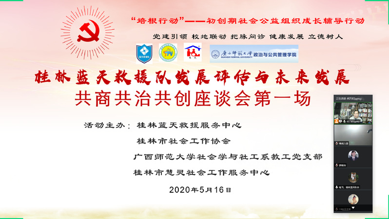 5月16日,“培根行动”之“桂林蓝天救援队发展评估与未来发展共商共治共创座谈会第一场”依托腾讯会议进行。我校政管学院社会学与社工系教工党支部党员何乃柱博士带领研究生组成团队,以“协作者”身份,为桂林市应急救援类非营利组织(NPO)——桂林蓝天救援队开展了组织现状评估、困境诊断、原因探析和发展对策的共商共治共创活动。