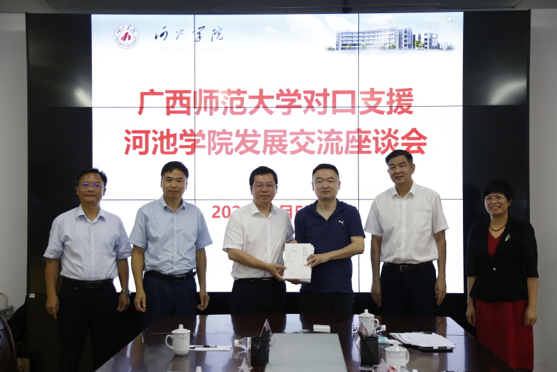 为进一步落实《广西师范大学河池学院对口支援协议》,推动我校与河池学院的交流与合作,6月4—5日,贺祖斌校长、黄文韬副校长、林春逸副校长率领校办/发规办、人事处、教务处、科技处、研究生院、文学院/新闻与传播学院、马克思主义学院、生命科学学院、体育与健康学院等部门和学院主要负责人一行赴河池学院开展对口支援交流活动并进行了座谈。河池学院党委书记韦安光、校长苗剑和副校长钟宏桃出席了会议,河池学院相关职能部门负责人和二级学院院长参加了会议。
