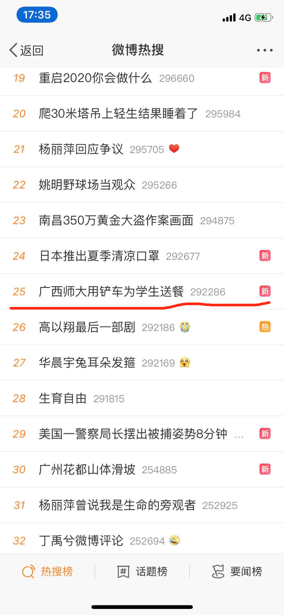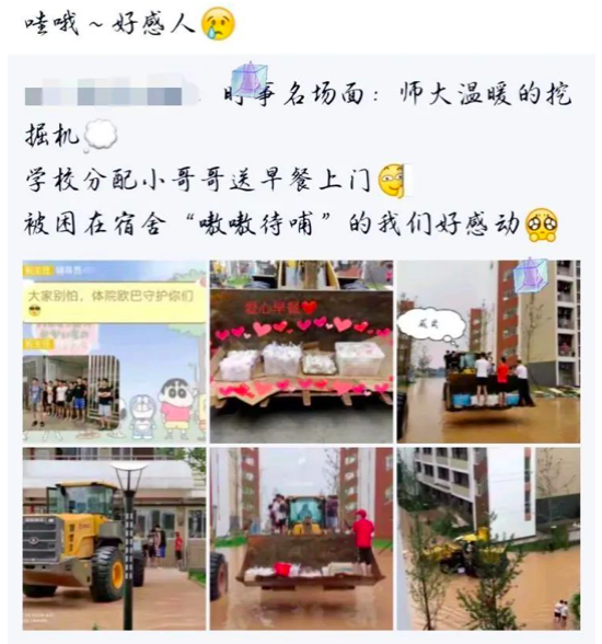 受暴雨影响,学生无法出行用餐,学校也是很贴心,今天(6月8日)曾在2017年7月登上过微博热搜的“铲车”再次出动,为学生送餐。