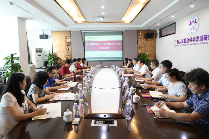 2020年9月9日下午,云南省社会科学界联合会秘书长李春一行7人来我校调研工作。广西壮族自治区社会科学界联合会副主席、我校校长贺祖斌出席座谈会,广西壮族自治区社会科学界联合会外联部副主任麦紫君、桂林市社会科学界联合会副主席邹靖以及我校社科处/广西文科中心、出版社集团等单位负责人及相关专家学者参加座谈交流。座谈会由社会科学研究处负责人主持。