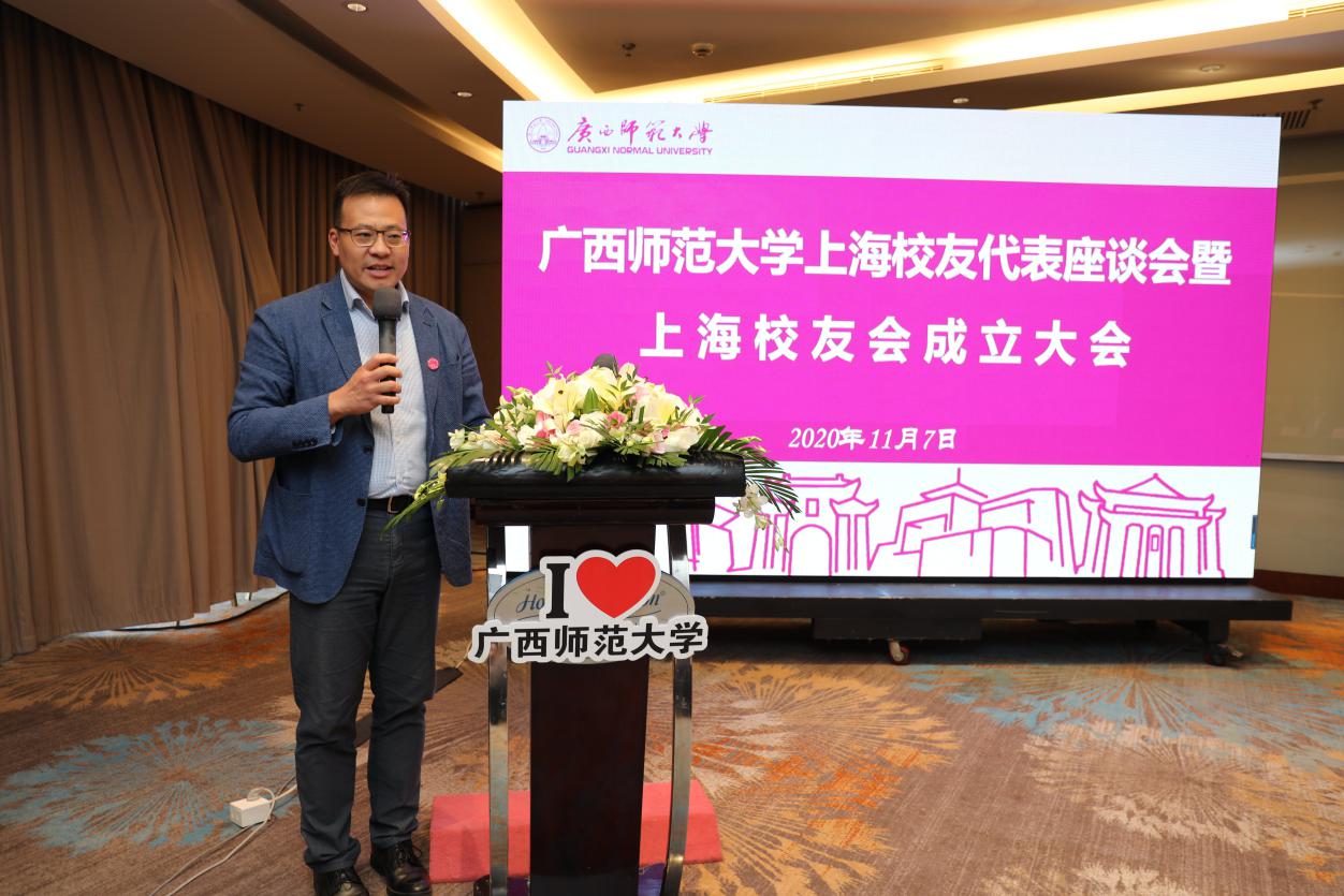 贺祖斌在大会上讲话。他首先代表学校对上海校友会的成立表示热烈的祝贺,对长期以来心系母校、关心和支持母校发展的校友们表示衷心的感谢,并介绍了母校建校88年以来的发展情况、取得的成绩。他指出,校友是学校建设发展的宝贵资源,学校非常重视校友工作,广西师范大学校友会自去年10月成立以来,相继在广西区内14个地级市、2所高校、1家国企成立了17个校友联络处,在区外相继成立了海南校友会、法学院北京校友分会、广东MBA校友会、江西校友会,搭建了新的校友组织机构。他希望,上海校友会成立后,充分发挥情感纽带作用,凝聚校友力量,畅叙校友情谊;充分发挥自己的优势,为当地经济建设和社会发展作出积极的、作为师大人的贡献。2022年,母校即将迎来90华诞,他希望校友们继续关注母校发展,两年后相约母校、齐叙友情、共商发展。