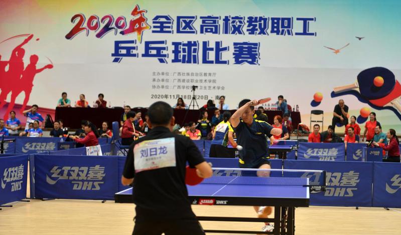 11月18日至20日,由广西壮族自治区教育厅主办的2020年全区高校教职工乒乓球比赛在广西建设职业技术学院体育馆隆重举行,全区35支代表队和25名校长组队员共328名运动员参加了本次比赛。