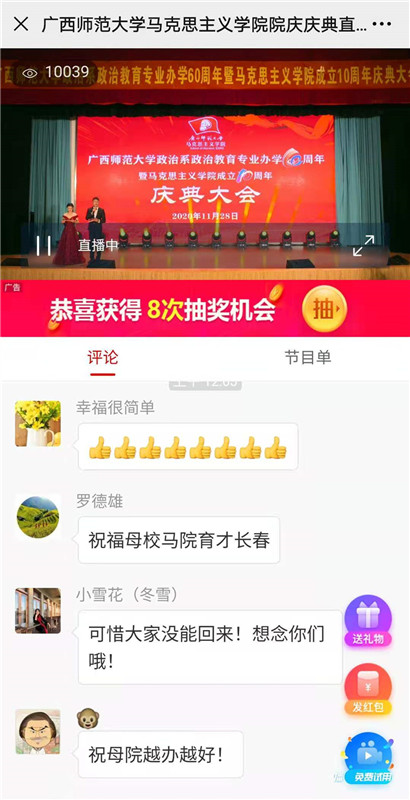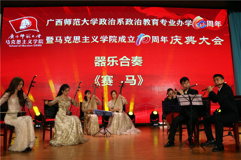 邓军最后说,有习近平新时代中国特色社会主义思想为我们指引前进的方向,由党中央、自治区党委和学校党委的坚强领导,有全体师生员工的团结奋斗,有广大校友院友的鼎力支持,学校一定会把马克思主义学院建设成为国内一流、有重要国际影响力,能够起到示范带动作用的马克思主义学院,推动马克思主义学院高质量发展走在前列。广西师范大学建设国内一流国际知名教师教育特色鲜明的国内高水平大学的目标一定能够实现。我校马克思主义学院的明天一定能够更加壮丽,更加辉煌。
