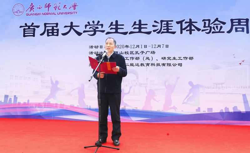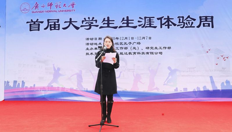 为进一步推进职业生涯教育,强化学生生涯规划意识,12月1日上午,由学工部(处)、研工部主办的广西师范大学首届大学生生涯体验周活动在雁山校区孔子广场正式启动。校党委副书记旷永青出席启动仪式并致辞。学工部(处)、研工部、教务处相关负责人,以及各二级学院分管学生工作副书记、职业生涯规划课程任课教师、辅导员代表、学生代表近500人参加启动仪式。启动仪式由大学生就业指导中心主要负责人主持。