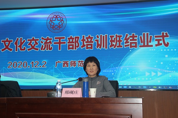 最后,中国侨联文化交流部副部长邢砚庄做了总结发言。她代表中国侨联文化交流部对我校承办此次培训班付出的努力表示感谢,并就本次培训班主要特点、主要收获与体会进行了归纳总结,要求学员们要抓好学习成果运用、要抓好持续深化学习、要抓好文化工作创新发展。