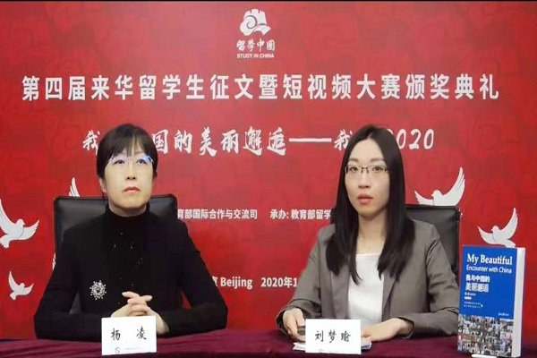 2020年12月8日下午,由教育部国际合作与交流司主办、教育部留学服务中心承办的第四届来华留学生征文暨短视频大赛颁奖典礼在线上举行。教育部国际合作与交流司副司长方军、教育部留学服务中心副主任杨凌出席了本次线上颁奖典礼并分别致辞,来自全国150余所参赛院校的获奖留学生代表以及留管老师200余人、人民日报海外版以及新浪网等新闻媒体记者一并参加了本次线上颁奖典礼。