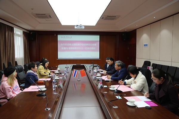 会上,苏桂发对彬嘉玛•塔维她雅浓一行来访表示热烈欢迎,并对总领事馆一直以来对广西师范大学的帮助与支持表示感谢。苏桂发简要介绍了我校的基本情况,并重点介绍了我校与泰国教育交流情况及在籍留学生情况。彬嘉玛•塔维她雅浓对我校的热情接待表示感谢,并希望双方能够一如既往地保持友好合作关系,促进两国的交流与了解。
