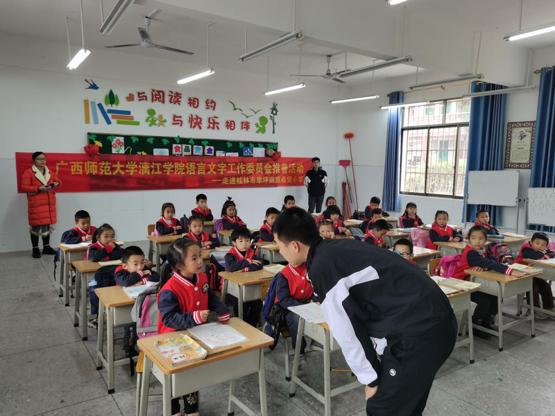 此次活动的对象主要是一年级学生。根据学生特点,漓江学院语委依据推普主题设立两个子活动,一是“传文化经典,诵千古之诗”诵读活动,选取两篇一年级课文及古诗,教授小学生掌握朗读技巧,同时就轻声、儿化等知识点进行重点教学;二是“泼墨造物,笔下生花”书写活动,以一年级笔画、笔顺等知识点为主要教学内容,同时指导学生正确的书写姿势。活动最后,漓江学院向桂林市草坪回族希望小学赠送文学、文化类书籍68册。