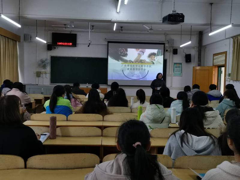 2020年12月10日下午,化学与药学学院邀请到桂林市大学生就业指导工作特聘专家、桂林莱茵生物科技股份有限公司综合部经理易桂青女士在学校理科楼206教室开展就业指导经验分享会。桂林莱茵生物科技股份有限公司人力资源部主管、学院制药工程专业首席教授、专业教师、年级辅导员以及2017级、2018级制药工程专业全体学生参加会议。