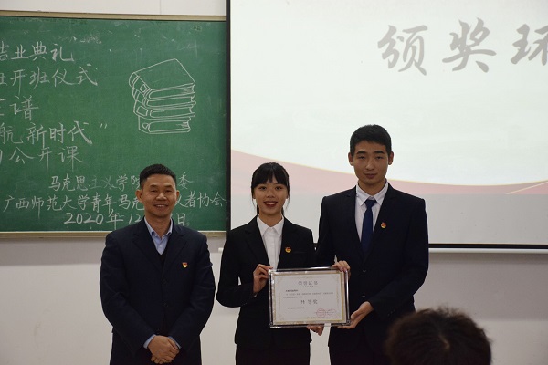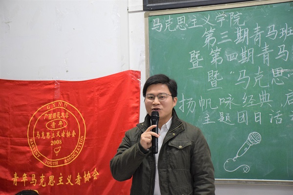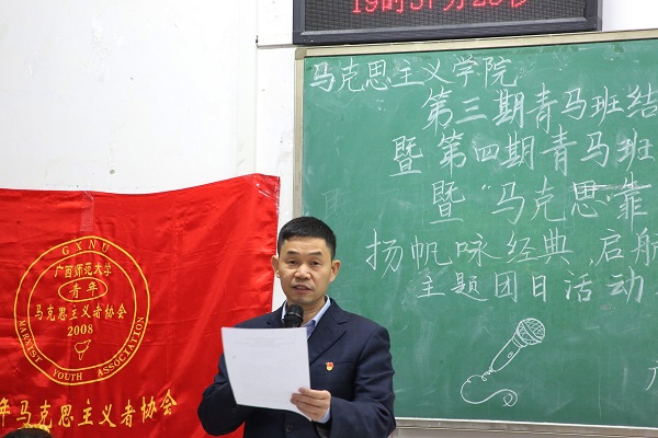 为贯彻落实团中央《关于深入实施青年马克思主义者培养工程的意见》的部署安排,增强马院学子阅读马恩经典原著的学习热情,培养一批优秀的青年马克思主义者,12月13日晚,马克思主义学院在雁山校区文四区201教室召开第三期青马班结业典礼暨第四期青马班开班仪式和“马克思﹒靠谱”——扬帆咏经典,启航新时代”主题团日活动公开课活动。学院党委负责人,团委老师,兼职辅导员,辅导员助理,校团委、校社团联代表,兄弟社团代表应邀出席活动,第三期、第四期青马班成员,各学院朗诵选手,研究生代表及2020级本科生共同参加此次活动。