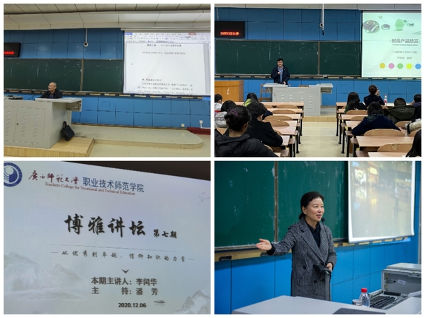 本学期博雅讲堂前七讲分别是牟向伟副教授主讲的《我的大学》、方建东副研究员主讲的《阳光心态,快乐成长——新生心理适应性教育》、邓小华副教授主讲的《走进职业教育的广阔天地》、罗星凯教授主讲的《科技探究,我能行!》、胡大雷教授主讲的《“博雅”之路——关于如何读国学经典》、宁绍强教授主讲的《时尚产品欣赏》、李闰华副教授主讲的《问题与责任——大学生学术科技竞赛选题与论文(调查报告)写作》。各位专家结合自身经历与体验,就大学生面临的热点问题、大学的文化精髓、人生智慧与态度等有关方面作了精彩报告,累计参与师生逾2000人次。2020年度博雅讲堂名家云集,丰富多彩的讲座以职师学院教育宗旨为命题,启迪心智,引导广大新生尽快适应大学、融入学院,使大家对专业知识、文化艺术、生活学习等多领域的感知更加清晰、深刻,增强了对职师学院文化素质教育的自信,充分发挥了文化育人功能,提升了职师学院文化建设软实力。
