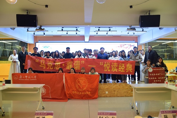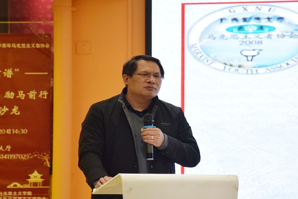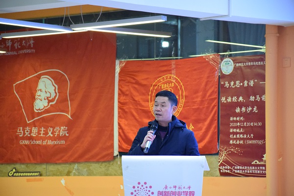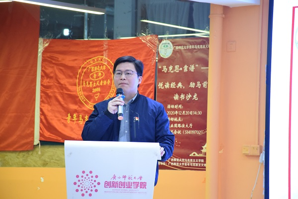 为积极响应阅读马克思主义经典的时代号召,进一步加强各高校马克思主义学院学生的学术交流,激发马院学子对经典著作的阅读兴趣,12月20日下午,马克思主义学院在雁山校区创业园路演大厅“马克思·靠谱——悦读经典,励马前行”读书沙龙活动。学院党委负责人、专任教师,辅导员出席本次活动。来自上海大学、桂林理工大学、桂林电子科技大学、广西师范大学的马院学生进行读书分享,学院第四期青马班学员和青年马克思主义者协会全体成员参加本次活动。本次活动由学院分团委书记主持。