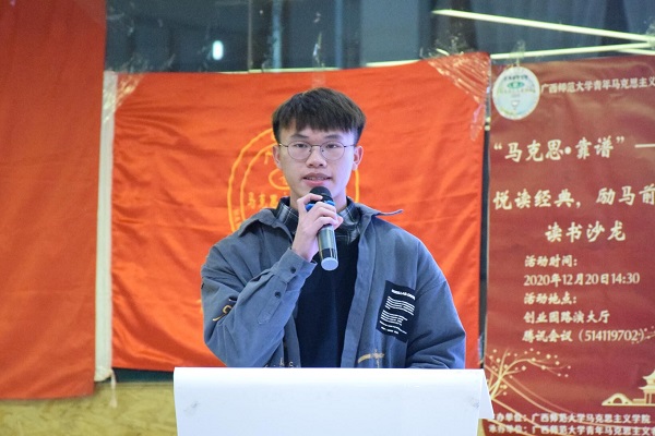 在读书沙龙环节中,2020级本科生代表蒙婕以《英国工人阶级状况》写作背景入手,结合事例生动阐述书中描述的贫富差距过大、环境污染严重等问题,为同学们还原19世纪40年代资本主义发展下阶级矛盾不断激化的英国,同时结合自身感受,鼓舞同学们以史为鉴,提高走中国特色新型工业化道路的理论自信,建设更加繁荣富强的新中国。2019级本科生代表刘清艺则结合时代特色针对《共产党宣言》内容的现实意义进行分析,她谈到:“我们必须学会运用《共产党宣言》中所阐明的立场、观点和方法来认清人类社会发展的客观规律和必然趋势,坚定走中国特色社会主义道路的信心和决心,把老一辈革命家开创的共产主义事业接过来、传下去,为实现科共产主义而奋斗终身!”来自上海大学研究生陶雨薇、桂林理工大学研究生王世珏、桂林电子科技大学研究生段天刚分别通过线上和线下的形式进行了精彩分享。