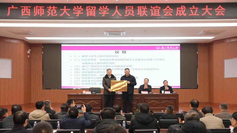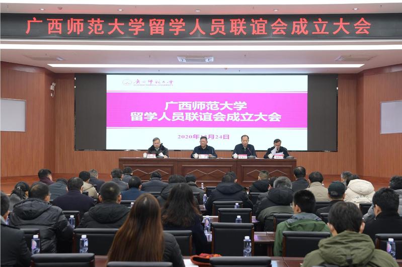 2020年12月24日上午,广西师范大学留学人员联谊会成立大会在育才校区国际教育交流中心2号楼201报告厅举行,校党委书记邓军,校党委副书记旷永青,校党委常委、副校长苏桂发,校党委常委、统战部部长黄海波,党办/督查办,组织部,宣传部,统战部,教师工作部负责人,二级单位党委(总支)书记,留学人员联谊会会员等近100人出席了成立大会。成立大会由旷永青副书记主持。