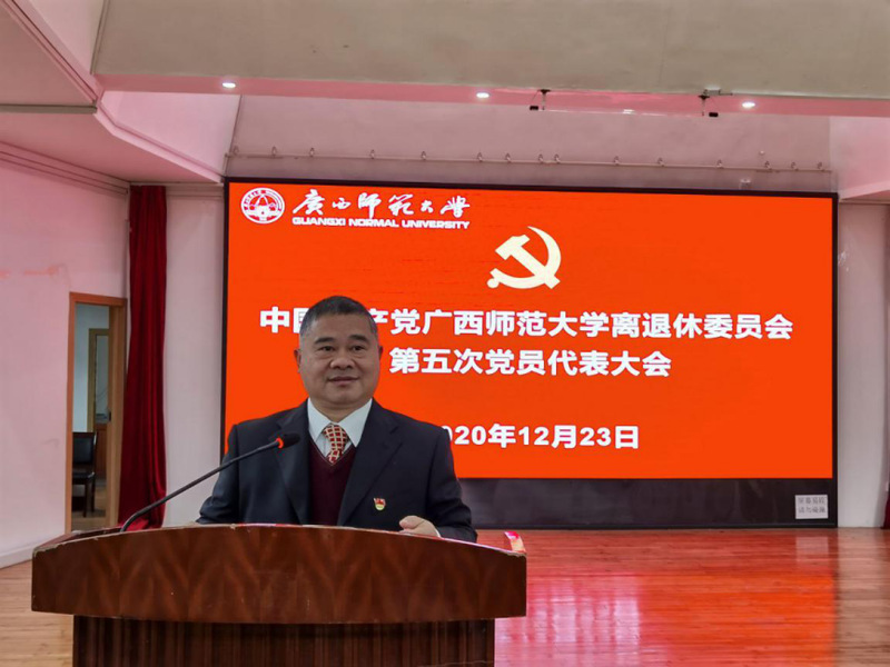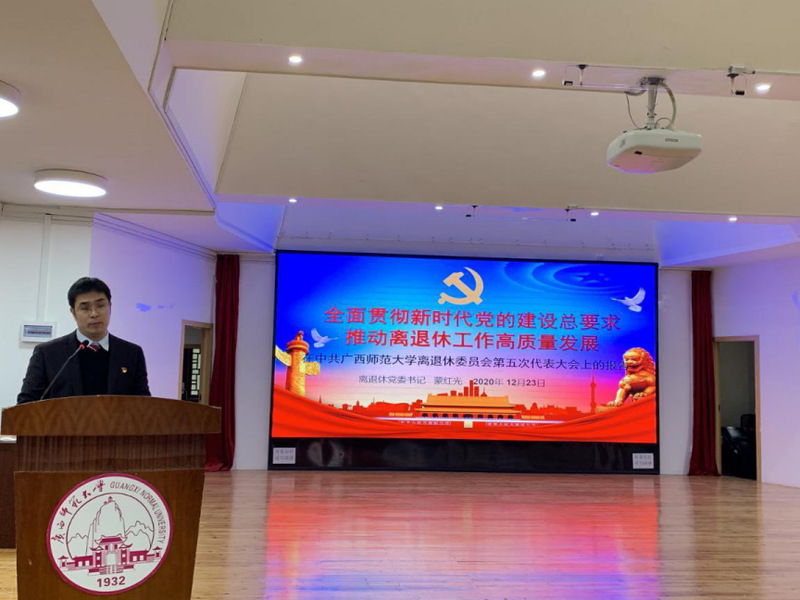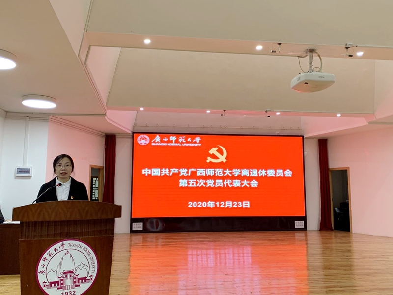 离退休党委负责人代表本届离退休党委作《全面贯彻新时代党的建设总要求,推动离退休工作高质量发展——中共广西师范大学离退休委员会工作报告》。报告回顾总结了本届党委、纪委四年来的工作,分析面临形势,谋划今后五年工作目标任务。他指出,通过换届工作,将增强离退休党委政治功能,提升离退休党委组织力,充分发挥离退休党委的政治核心作用和战斗堡垒作用,团结带领全体党员,为实现学校“十四五”发展目标,奋力实现高水平大学建设,推动离退休工作高质量发展。