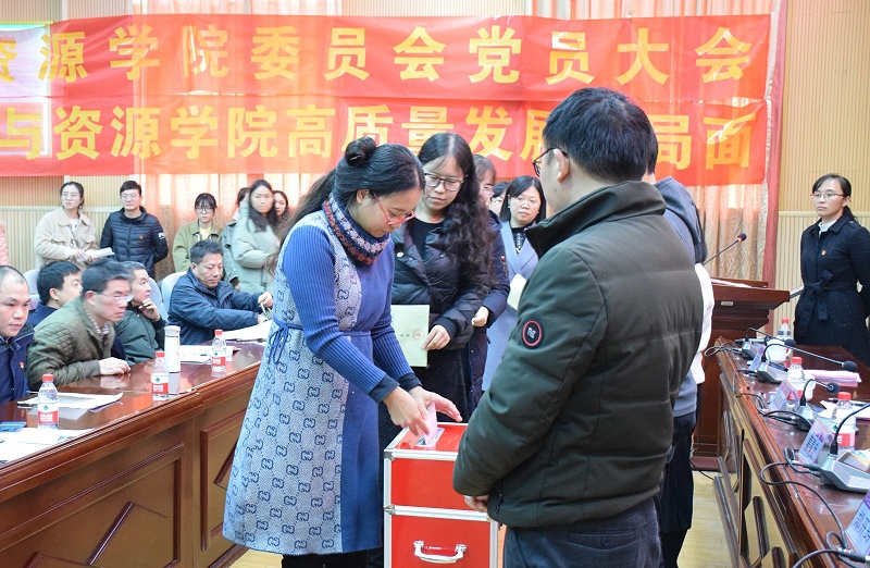 跟着,大会进入学院党委、纪委换届选举环节。党员大会正式党员通过举手表决,通过了《中共广西师范大学环境与资源学院委员会党员大会选举办法》(草案)、通过了大会监票人名单、确定了新一届党委、纪委委员候选人名单。在监票人检查好票箱后,由计票人分发选票,主持人说明了填写的注意事项。会议采取差额选举办法,以无记名投票方式进行选举,与会正式党员履行光荣职责,投出神圣选票。在等待计票结果出来期间,与会党员同志们还一同观看了十九届五中全会、脱贫感恩等节选的学习视频。