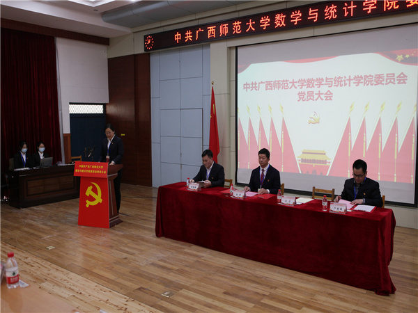 1月8日下午,中共广西师范大学数学与统计学院委员会党员大会在雁山校区文二区219大学生学术报告厅隆重召开。校纪委办相关负责人到会指导,大会由数学与统计学院党委副书记主持,学院124名正式党员出席大会。