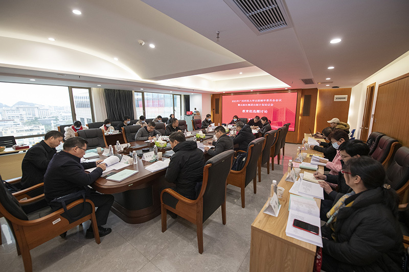 校领导旷永青、赵铁、黄文韬、孙杰远、李英利出席会议。校党委副书记赵铁作为社科人文组召集人,校党委常委、副校长孙杰远作为教育组召集人,分组讨论了出版社集团2021年度选题计划,审议了“广西师范大学出版编审委员会章程(草案)”,并进行总结。