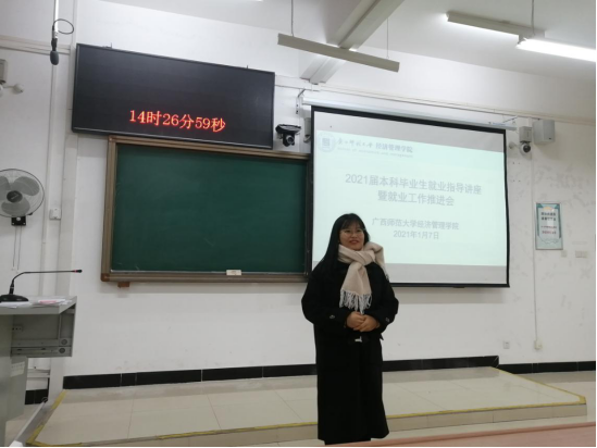 1月7日,经济管理学院在雁山校区厚藩楼理二区501教室举办2021届本科毕业生就业指导讲座暨就业工作推进会,在校本科毕业班学生现场参会,其他学生通过腾讯会议线上参会,合计参会人数近200人。本次就业指导讲座特邀学校学工部(处)林萱老师主讲。
