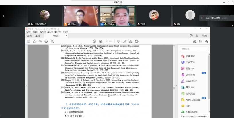 经管学院经过前期积极准备和详细部署,目前共收集到14项2021年度国家自然科学基金申报材料,并于2021年3月6日下午顺利举办云端评审会,本次评审会邀请到了教育部长江学者特聘教授、国家基金会评专家,福州大学经济与管理学院王应明教授作为论证专家,评审会由学院相关负责人主持。王应明教授从老师们的选题、课题论证逻辑、各个部分的论证技巧,甚至注释和参考文献规范等细节对14份申报书进行了逐一点评。王教授细致而专业的点评对老师们接下来进一步完善申报书助益甚大,对提高我院国家自科基金申报成功率至关重要。