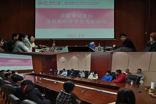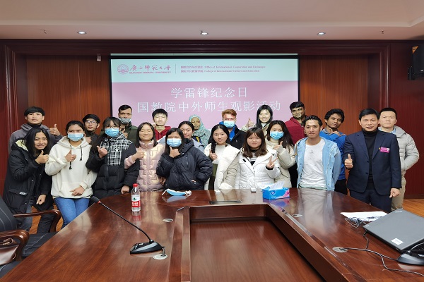 今年3月5日是毛泽东主席题词“向雷锋同志学习”的58周年纪念日,也是第22个中国青年志愿者服务日和第1个“广西志愿者日”。为深入弘扬雷锋精神,发扬志愿者精神,国际文化教育学院于3月5日在育才校区国际交流中心二号楼211会议室组织中外师生举办“学雷锋纪念日国教院中外学生观影活动”。国际学生管理科全体教师以及国教院中外学生一同参加本次活动。