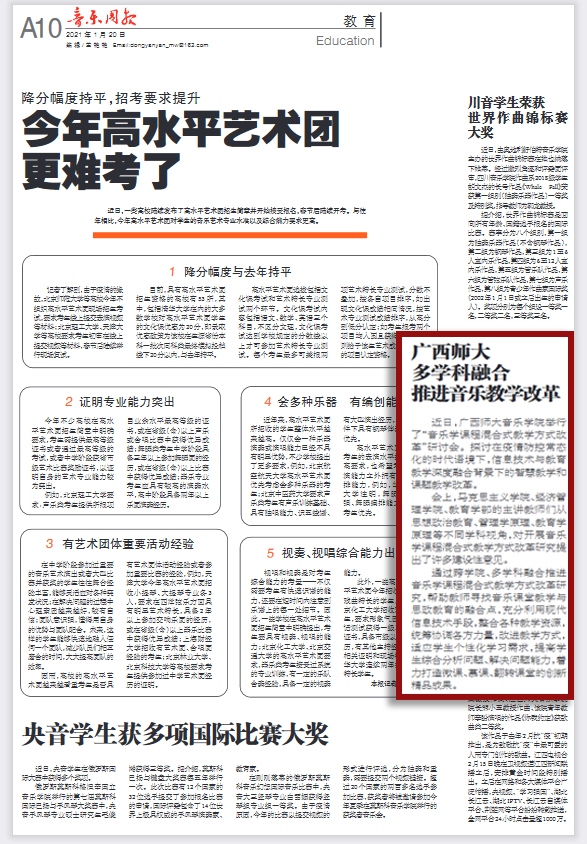 近日,《音乐周报》以《广西师大多学科融合推进音乐教学改革》为题,报道我院在疫情防控常态化背景下举行的“音乐学课程混合式教学方式改革”研讨会。学院在信息技术与教育教学深度融合的智慧教学和课题教学改革所取得的阶段性成果受到关注。