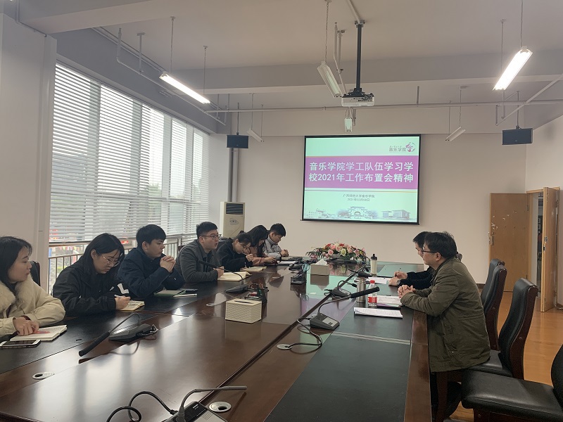 为深入贯彻落实2021年学校工作布置会精神,进一步部署学院2021年度新学期重点工作。3月8日上午,音乐学院召开学工例会,学习贯彻2021年学校工作布置会精神。学院党委书记、全体专兼职辅导员出席会议,会议由学院党委副书记主持。