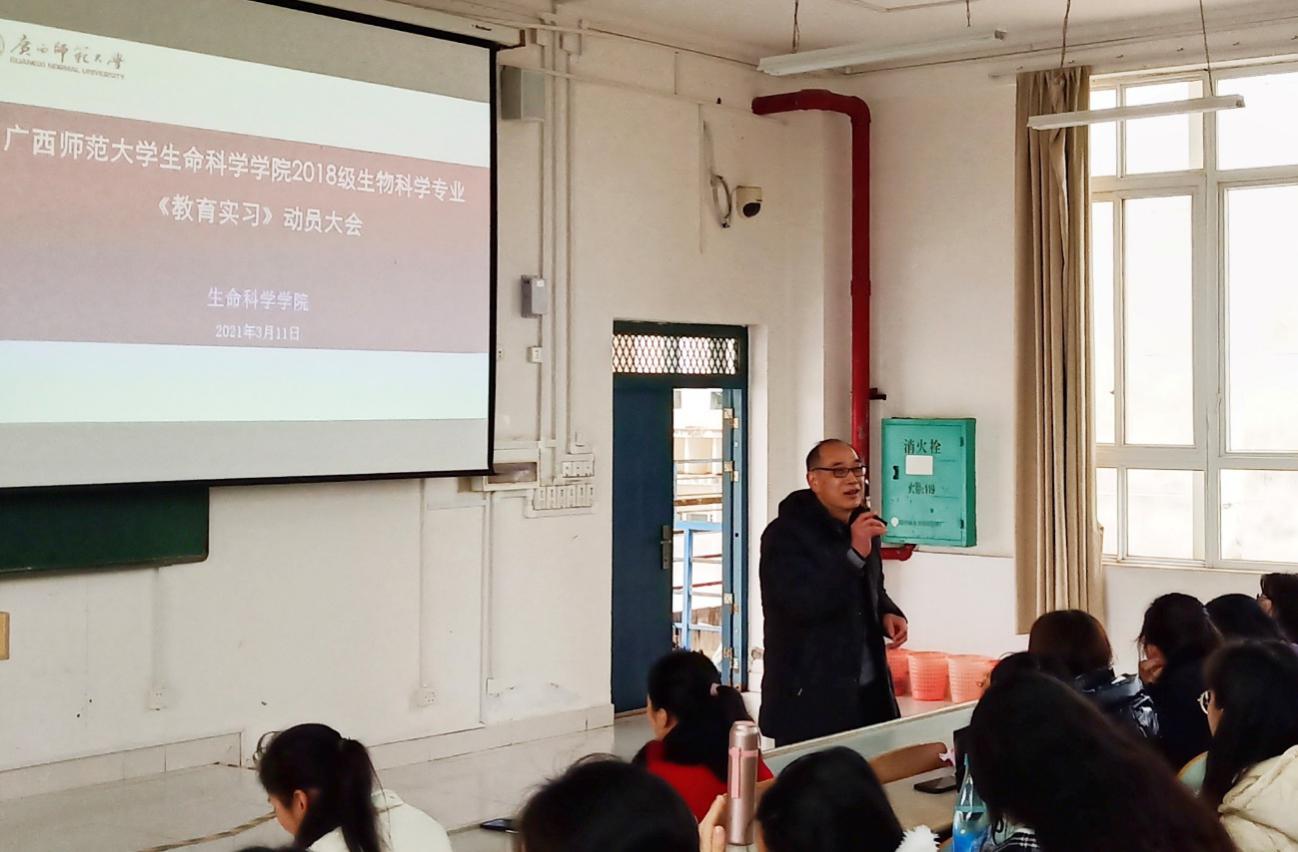 会上,生命科学学院教学工作主要负责人首先对2018级生物科学专业本科生教育实习的工作做了具体的安排部署和指导要求,并为同学们详细解读了《广西师范大学生命科学学院2018级教育实习计划》,向同学们介绍了此次教育实习改革的具体实施方案,教导同学们要珍惜实习机会、敢于迎接挑战,在实习中勤思好问,积极总结反思,不断积累教学经验,提升自身教学技能。教育实习带队老师针对实习过程中的常见问题为同学们进行解答,并对学生教育实习工作顺利开展提出殷切期望。