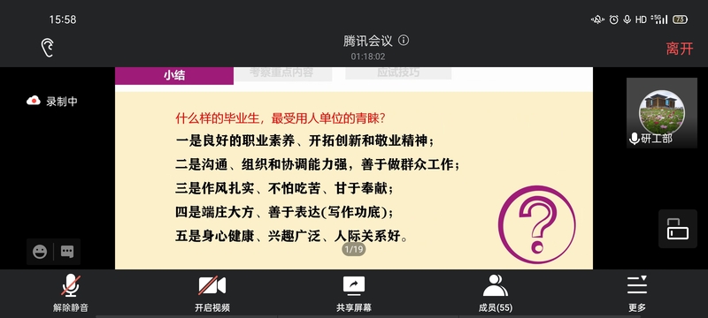 何期老师从高校的内涵和精神、高校辅导员的角色与定位、高校辅导员招考与职业发展三大层面讲述“如何成为一名高校辅导员”,梯次推进,重点突出,细致全面。针对意向高校辅导员行业毕业生的就业需求,何老师重点讲授了高校辅导员如何招考以及如何应考。当谈到辅导员招录考察的重点内容时,何老师从总书记系列讲话精神、国家教育政策文件延伸到辅导员必备知识和职业技能,并以突发事件为例,深入展开,引人深思。5个面试真题的应试技巧讲解,包括面试礼仪、自我介绍、肢体动作、掌握信息、调节情绪等,何老师结合20余年的学生工作经验,理论与案例深度结合,语言风趣幽默,分析精炼独到,引发了现场同学们的赞叹和掌声。接着,何老师就薪资待遇、发展空间等毕业生关注的问题,实事求是地讲述高校辅导员的职业发展,让现场聆听的师生再次领悟到辅导员工作的使命光荣、责任重大。