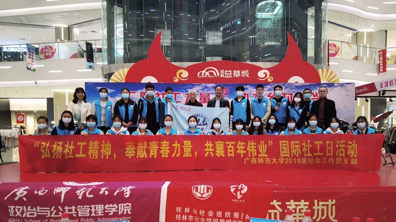 为响应国际社会工作日的主题精神,贯彻民政部社会工作宣传周的活动要求,进一步向社会广泛宣传普及社工知识、弘扬社会工作专业精神,政治与公共管理学院2018级社会工作团支部联合广西师范大学社会工作协会,在社会学与社会工作系专任教师的指导下,围绕“弘扬社工精神,奉献青春力量,共襄百年伟业”开展了系列主题宣传和实践活动。