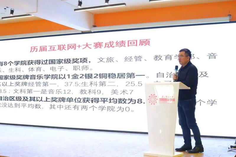 创新创业学相关负责人副院长罗元通过回顾我校历届“互联网+”大赛成绩,着重从文理工科、项目类别、成功经验等数据和因素,系统的分析了我校获奖项目的基本情况。按照时间进度,介绍了第七届“互联网+”大赛的各项工作要求,包括组织报名、大赛指导师资培训、参赛项目训练营、“青年红色筑梦之旅”活动启动及校赛、区赛的具体安排。他强调,各个二级学院(部)要充分认识这次“互联网+”大赛的重要性,明确任务、通力合作,充分调动老师和学生的积极性,积极挖掘项目,鼓励师生共创,提升项目数量的同时保证项目质量。