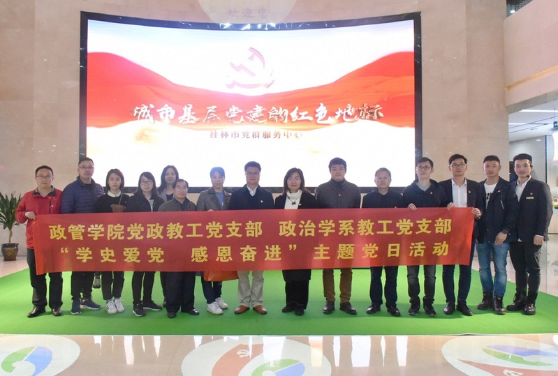 百年奋斗路,启航新征程。为进一步激发教工党员保持干事创业的热情、坚定立德树人的初心、推进党史学习教育的走深走实。4月12日下午,政管学院党政教工党支部、政治学系教工党支部一行15人赴桂林市党群服务中心联合开展“学史爱党 感恩奋进”主题党日活动,学院党委主要负责人、相关负责人以普通党员身份参加活动。
