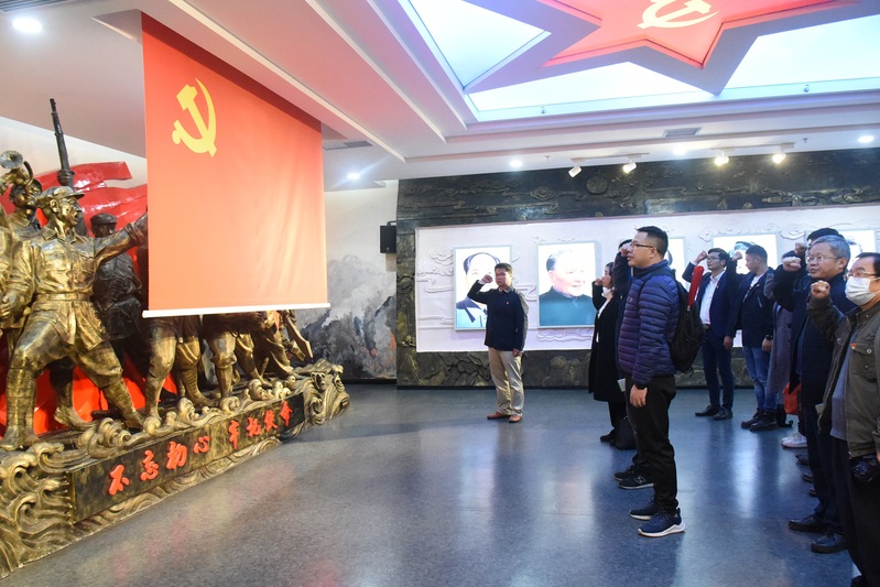 桂林市党群服务中心是一个集教育、管理、咨询、培训、服务、体验于一体的党群工作平台,是全市党员教育培训的示范基地。在中心讲解员、学院2018级公共管理专业硕士涂明鉴的专业讲解下,全体党员先后参观了党史党建展厅、智慧党建调度室、组织生活馆、红色影院等功能区域,通过听取讲解充分了解了桂林的红色历史、党建发展、整体规划以及各项社会事业的蓬勃发展的新景象。走进党史党建展厅的“不忘初心”展区,党员们心潮澎湃,高唱国际歌、国歌,嘹亮的歌声回荡在上空。在学院党委主要负责人的领誓下,全体党员面向党旗郑重宣誓。铮铮誓言愈加坚定了大家践行誓词、终生不渝的初心信念。来到互动体验区域,全体党员重温了红军血战湘江的英雄史诗,聆听了桂林市优秀党员、劳动模范的先进事迹,观看了以桂林市脱贫攻坚先进个人和驰援武汉医护工作者为原型创作的微电影,再次深深感受到作为教工党员的责任、使命与荣耀。