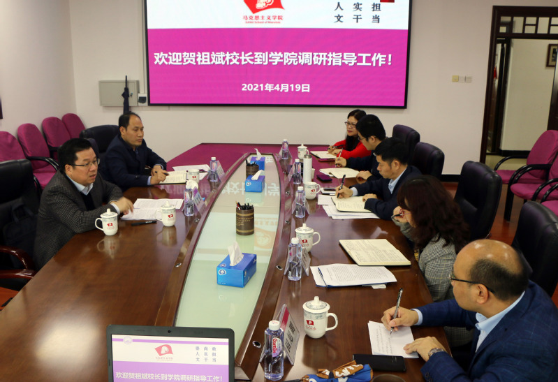 在马克思主义学院,贺祖斌听取了学院主要负责人就学院今年重点工作及党史学习教育开展情况汇报。他指出,马克思主义学院作为全国重点马克思主义学院,要把握形势,抢抓机遇,开拓进取,乘势而上,推动学院各项工作再上新台阶,让全国重点马院品牌在全国打响,以优异成绩迎接建党100周年。