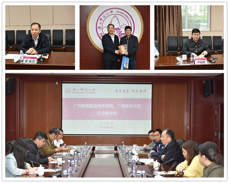 4月19日,广州番禺职业技术学院党委副书记李铭辉一行5人来我校调研交流。交流会在育才校区新国教楼211会议室举行。会议由我校党委副书记旷永青出席并主持座谈,我校学生工作部(处)负责人、学生工作部(处)相关科室负责人、计算机科学与工程学院/软件学院团委负责人等参加交流座谈。