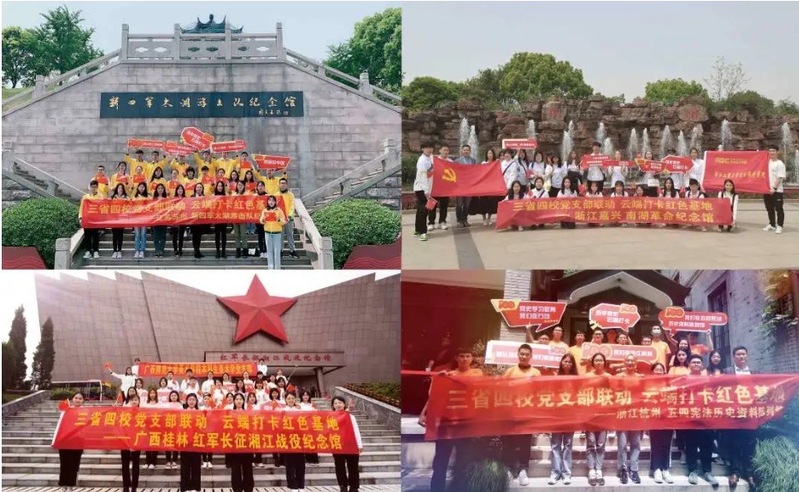 4月17日,一堂特别的党史教育沉浸式实境党课在三个省份四所高校的4个师生党支部同时进行。广西师范大学美术学院、浙江工商大学艺术设计学院、苏州大学敬文书院、杭州电子科技大学管理学院的师生党员相约同时探访所在城市的红色基地,通过网络连线的方式共享学习成果,实现了一次跨越千里的云端打卡联动。