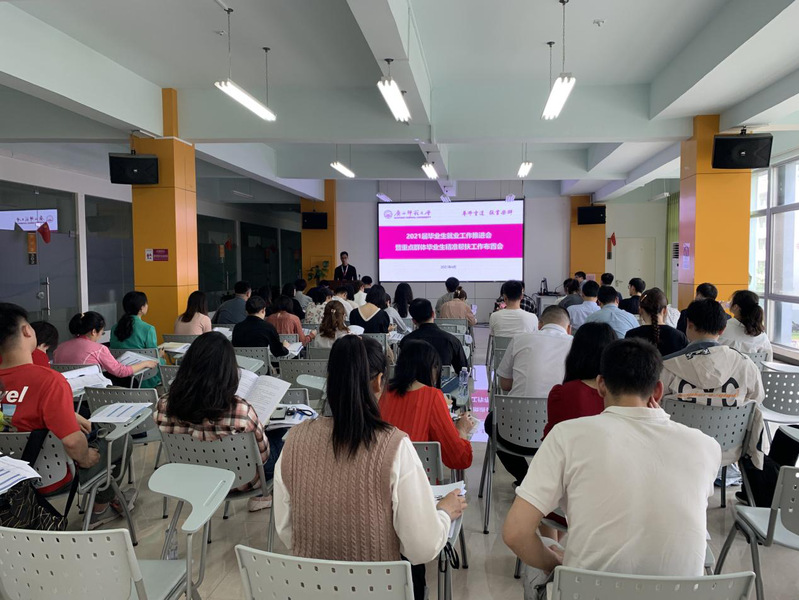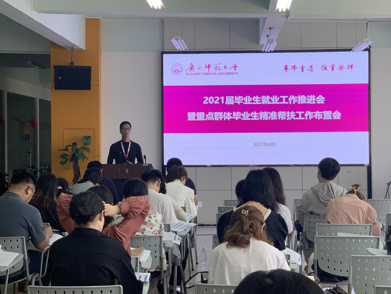 4月23日下午,校学工部(处)、研工部在雁山校区大学生就业指导中心联合召开2021届毕业生就业工作推进会暨重点群体毕业生精准帮扶工作布置会议,及时传达学习《自治区教育厅关于做好2021年全区高校毕业生就业创业工作的通知》文件精神、校党委旷永青副书记在2021年春季学期第二次学生工作例会上的讲话精神,推进毕业生稳就业各项工作,专项安排布置重点群体毕业生精准帮扶工作。会议由学工部分管就业工作负责人主持。研工部分管就业工作负责人、2021届毕业班专兼职辅导员及大学生就业指导中心全体人员参加了会议。