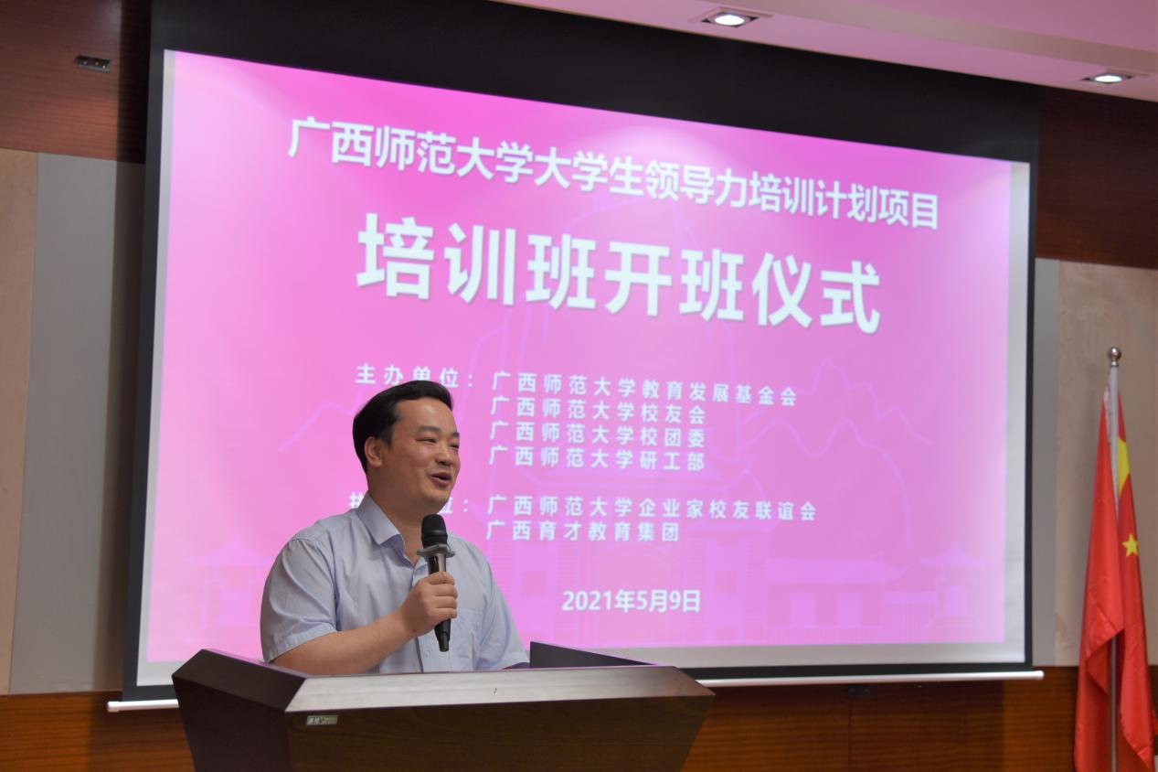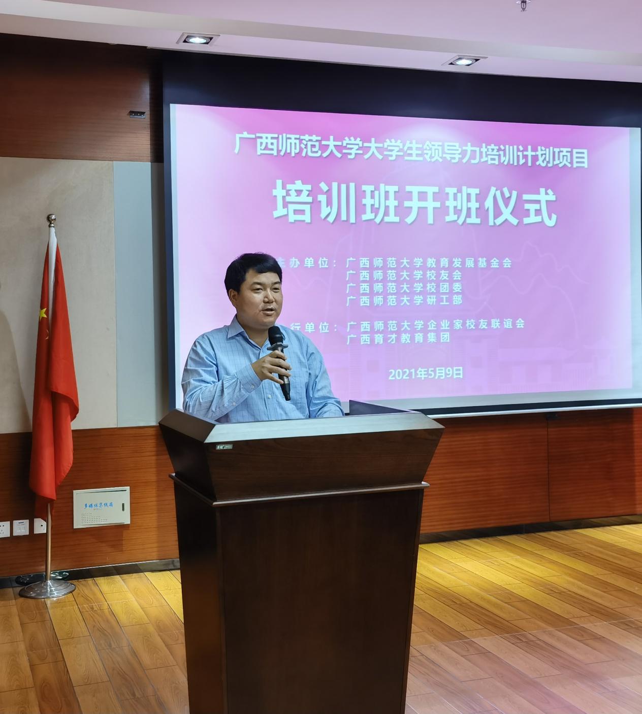 承办方代表广西育才教育投资集团梁国坤校友在开班仪式上发言。他表示,自己大学和研究生生活都是在师大度过,母校的情怀让他在注册创立第一个企业的时候使用了“育才”这两个字。他通过自身的学习和工作经历意识到,要想让大学生在毕业之后迅速和社会接轨,在大学期间接受社会实践培训是非常必要的。为此,此次培训设立了专门的社会调查课程,希望同学们通过学习,锻炼毅力,增强才干,提高认知,并在未来的社会工作中切身感受到这次培训的作用和价值。