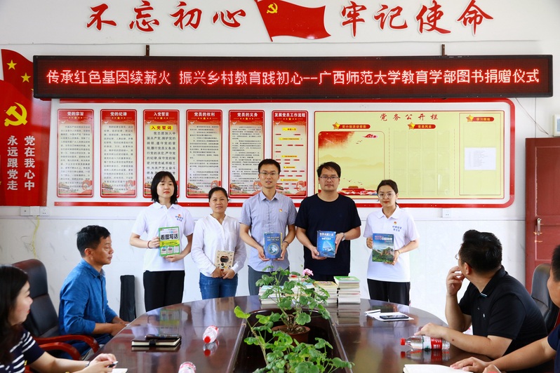 活动结束后,广西师范大学教育学部为车田苗族乡初级小学送上了募捐的图书、画册100本,文具若干。学部相关负责人表示,希望本次活动能够为助力乡村教育起到良好的示范作用,挖掘教育文化内涵,助力乡村基础教育发展。他指出,学部还将依托自身优质地师资培训资源,探索名师进校等乡村教师培训合作新模式,切实打通乡村教育发展的“最后一公里”,为振兴乡村教育事业尽一份绵薄之力。车田苗族乡党委相关负责人表示,活动的顺利开展极大地丰富了车田苗乡党史学习教育形式,实现红色文化引领和服务乡村教育发展。